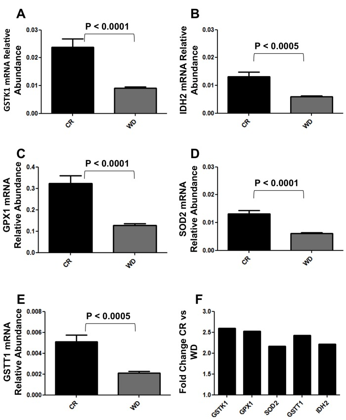 Mammalian fibroblasts have been extensively used to assess global transcriptional changes induced by circulating factors (i.e. serum) on cell function [9]. To test the hypothesis that the CR-induced changes in circulating factors can influence cell function, we compared the transcriptional profiles of human primary fibroblasts treated with CR or WD serum. Differentially expressed genes were selected using a moderate t-test approach [10] and multiple test correction [11], and these genes were used to identify transcriptionally altered pathways. Ingenuity Pathways Analysis software (IPA) showed a significant association of a subgroup of 83 genes (Supplementary Table S1) with many oxidative response-related pathways (Fig. 1). In particular, NF-E2-related factor 2 (Nrf2)-mediated oxidative stress response contained 30 genes that were dysregulated in the treated fibroblasts (BH p-value 3.33E-02), and many of them were direct expression effectors of Nrf2 activity (Fig. 2). Meta-analysis performed using a competitive gene set test [12] pinpoints 11 molecular signatures significantly down-regulated in a ‘self-contained’ gene test (Table 2 red Highlights). To further investigate the result of microarray data and confirm the association with oxidative response-related pathways, we performed quantitative real-time PCR for the following genes which were shown by microarray to be detectable and significantly dysregulated: GSTK1, GPX1, SOD2, GSTT1, and IDH2. As shown in Figure 3, relative abundance of message for these genes was significantly higher in the CR group than the control group (p<0.0005) with a fold change difference ≥ 2.2-fold.