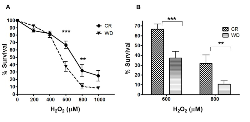 To confirm the gene expression findings with a functional test, human primary fibroblasts cultured for 48 hours with CR or WD sera were exposed to increasing concentrations of the powerful oxidizing agent, hydrogen peroxide (H2O2) for 24 hours. As shown in Figure 4, treatment with H2O2 produced a dose-dependent decline in survival, but fibroblasts cultured with CR serum were significantly protected from the cytotoxic effect of the oxidant. At 600 μM about 67% of cells pretreated with CR serum were viable, while only 37% of cells pretreated with WD serum survived (p< 0.001), and even at higher H2O2 concentrations (800 μM) 32% of the cells pretreated with CR serum survived, while only 10% of the cells exposed to WD serum were still alive (p< 0.01).