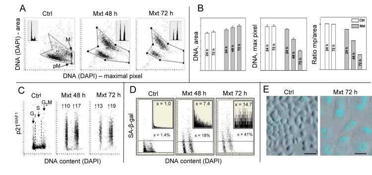 One of the most characteristic features of cells undergoing senescence is change in their morphology revealed by an increase in cellular and nuclear size. In the case of cells growing attached this manifests by their dramatic “flattening” appearance combined with markedly reduced cell density at confluence [42,43]. The morphometric analysis of cell nucleus by laser scanning cytometry (LSC) is a sensitive detector of such a change [39,40]. Premature senescence of A549 cells was induced by their exposure to 2 nM DNA topoisomerase inhibitor mitoxantrone (Mxt), the drug that interacts with DNA by intercalation and is a type II DNA topoisomerase inhibitor [44]. Fig. 1 illustrates the features of these cells undergoing senescence, including their morphological changes that were measured by LSC. The morphometric analysis of the nucleus stained with the DNA fluorochrome DAPI shows an increase in nuclear area concomitant with the decrease in intensity of DAPI maximal pixel fluorescence [39]. The integral of intensity of DAPI fluorescence over the nucleus reports DNA content and thus the cell cycle phase, which as seen Fig. 1 (insets), indicates cell arrest in G1 and G2M with paucity of S-phase cells in the Mxt-treated cultures. Since nuclear area in senescent cells is increased and DAPI maximal pixel decreased the ratio of maximal pixel to the area (Mp:area) provides an even more sensitive marker reporting this change in cell morphology than either of these measurements alone (Fig. 1B). The cells arrested in G1 and G2M in the Mxt-treated cultures show 10 to 19-fold increase in expression of the CDK inhibitor p21WAF1, the another marker of cellular senescence [42,43]. Activation of the senescense-associated β-galactosidase A-β-gal), another hallmark of cellular senescence [42,43] is also markedly elevated in cells growing in the presence of Mxt. The rise in SA-β-gal activity measured by LSC is expressed either as percent of the enzyme-positive cells, which is augmented from 1.4 to 23% and 44%, or the mean value of the light absorption of the SA-β-gal product, increased 8.4- and 17.7-fold, in cells from cultures growing with Mxt for 48 and 72 h respectively (Fig. 1; D,E).