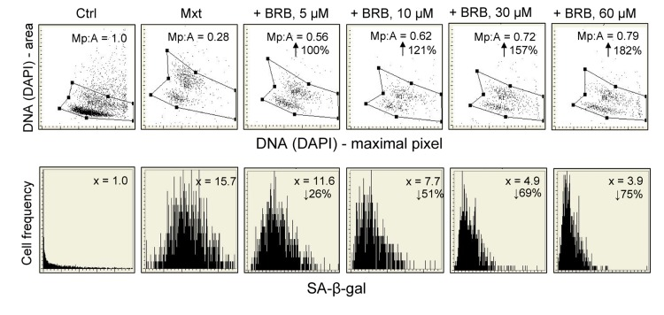 Induction of senescence of A549 cells growing in the presence of Mxt is distinctly suppressed, in a concentration-dependent fashion, by BRB (Fig. 2). Thus, the morphometric parameter reporting the nuclear change (Mp:area) which in the presence of Mxt alone is decreased from 1.0 to 0.28, in cultures treated with Mxt and 5 μM BRB is decreased to only 0.56, which is a 100% reduction compared to Mxt alone. At higher BRB concentration this effect is more pronounced, and at 60 μM BRB the reduction is 182% vis-à-vis Mxt alone. The attenuation of the Mxt-induced senescence by BRB, when measured by the induction of SA-β-gal activity, is also quite evident, and BRB-concentration dependent. The BRB-induced decrease of SA-β-gal activity in Mxt-treated cells was 26% at 5 μM BRB and further decreased to 75% at 60 μM concentration (Fig. 2).