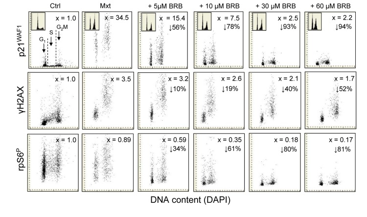 Fig. 3 illustrates the effect of BRB on expression of p21WAF1, γH2AX and ribosomal protein (rpS6) phosphorylated on Ser235/236 (rpS6P) in A549 cells, detected by phospho-specific Ab, induced to senescence by treatment with Mxt for 5 days. The Mxt-induced senescence of these cells manifests in dramatic increase in expression of p21 (34.5-fold), which is more pronounced than after 3 days of treatment with Mxt (Fig. 1). However, the increase in expression of p21 is markedly reduced in cells treated with Mxt in the presence of BRB and the reduction is BRB-dose dependent, starting with 56% at 5 μM and decreasing by 94% at 60 μM concentration. The induction of p21 by Mxt is paralleled by cell arrest in G1 and G2M phases of the cell cycle, and the arrest in G2M is to some extent reduced at 5 and 10 μM BRB (top panels, insets). The Mxt-induced senescence is also marked by 3.5-fold rise in expression of γH2AX and this rise is also attenuated, in a concentration-dependent fashion, by BRB, varying from 10% to 52% at 5 to 60 μM concentration of this isoquinoline. Phosphorylation of rpS6 on Ser235/236 is reduced by 11% in cells induced to senescence by Mxt alone. However, there is a dramatic further reduction in expression of this phosphorylated protein in cells growing in the presence of Mxt and BRB compared with Mxt alone, also in the dose-dependent mode, from 34% at 5 μM, to as much as 81% at 60 μM BRB concentration.