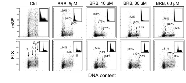 The results shown in Figs. 1-3 demonstrate that the induction of premature cellular senescence of A549 cell by treatment with Mxt is distinctly attenuated by BRB and the attenuation is already evident at its 5 μM concentration. In our prior study we observed that treatment of several cell types including A549, TK6, WI-38 cells and normal proliferating lymphocytes with different potential gero-suppressive agents reduced both, the mTOR- as well as DNA damage- signaling [33]. Among these agents was BRB which at 60 μM concentration was seen to markedly suppress the level of constitutive phosphorylation of mTOR, rpS6 and 4EBP1 as well as of H2AX. These findings were consistent with the notion that BRB had potential gero-suppressive properties combined with the ability protect DNA from endogenous oxidants [33]. In light of the current observation that 5-60 μM BRB suppresses induction of the premature senescence we have tested its ability at these lower concentrations to affect the level of constitutive mTOR signaling in cells not induced to premature senescence. Such low BRB concentrations are relevant in terms of the drug pharmacokinetics and its in vivo effects [45-48]. To this end we treated human lymphoblastoid TK6 cells, the cells which we explored in the prior study [33], with the range of BRB concentration as used for A549 cells. As is evident from the data in Fig. 4 growth of these cells in the presence of 5 – 60 μM BRB led to a distinct reduction of rpS6 phosphorylation. The reduction was evident already at 5 μM BRB and at that concentration its extent showed distinct cell cycle phase specificity. Namely at 5 μM the reduction was more pronounced in G2M- and S- phase cells, lowering expression of rpS6P in these cells by 60% and 49%, respectively, compared with 39% for G1 cells. The degree of suppression of rpS6 phosphorylation was BRB-concentration dependent, reaching over 80% for the G2M and S-phase cells at its 60 μM concentration. The BRB concentration-dependency was quite apparent from the rpS6P frequency histograms (Fig. 4 top panels, insets).