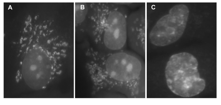 BRB is fluorescent and its fluorescence and localization in mitochondria in live cells was initially reported by Borodina and Zelenin in 1977 [51]. Its fluorescence is maximally induced by UV light at 421-431 nm and emission is within a wide range of green to yellow (514-555 nm) wavelength [52]. In binding to mitochondria BRB has an affinity to respiratory electron transport chain and the extent of its binding appears to correlate with mitochondrial potential ΔΨm [53-55]. This is in analogy to another mitochondrial probe rhodamine123 (Rh123) which is a widely used marker of mitochondrial energizing [56,57]. We have presently observed that 60 min exposure of A549 cells to BRB distinctly labels mitochondria (Fig. 6). This can be seen however for only for short period of time after exposure to blue light (< 3 min) or even shorter (< 1 min) to UV light. With longer exposures the BRB fluorescence disappears from mitochondria and undergoes translocation to nuclei and nucleoli (Fig. 5). It should be noted that BRB fluorescence was not apparent in cells that were fixed and subsequently rinsed, and thus it did not interfere with the subsequent measurement of fluorescent markers reporting mTOR/S6- and DNA damage- signaling.