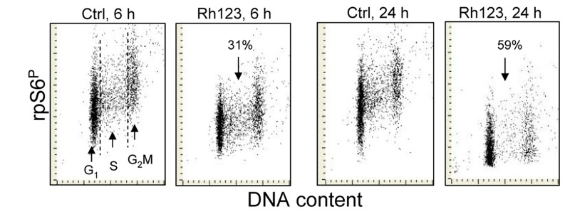 The evidence in literature [53-55] and our observation (Fig. 5) indicate that in live cells BRB localizes in mitochondria where most likely it interferes with the electron transport chain. It may be suspected therefore that its presently measured effect namely attenuation of phosphorylation of rpS6 may be mediated by targeting electron transport in mitochondria. We have tested therefore the effect of a classical mitochondrial potential probe Rh123 [56,57] on rpS6 phosphorylation. As is evident from the data in Fig. 6 exposure of A549 cells in the presence of Rh123 leads to a decline in the level of constitutive phosphorylation of rpS6. The effect is not cell cycle-phase specific but related to time of exposure to Rh123, as 31% decrease is noted after 6 h and 59% after 24 h of treatment with Rh123, respectively.