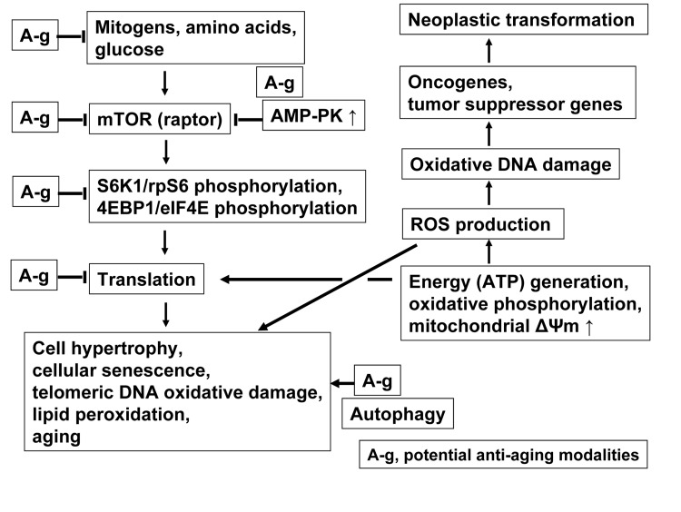 Our observation that the gero-suppressive agents inhibit constitutive level of mTOR activation concurrently with reduction of DNA damage signaling [33] provides evidence of a direct linkage between mTOR activation and oxidative DNA damage (Fig. 7). This is expected since translation requires production of energy (ATP) through oxidative phosphorylation which generates ROS; the increased ROS production (translation) leads to a greater oxidative DNA damage. It should be noted however that when ROS induce damage to telomeric sections of DNA this has an effect in promoting replicative senescence (Fig. 7). Likewise, the ROS-mediated lipid peroxidation is another marker of cellular senescence and aging.