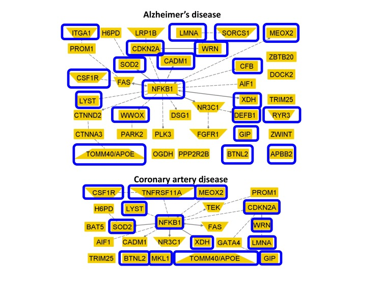 Figure 3 shows two networks of genes associated with Alzheimer's and coronary artery disease that included SNPs in the list of 281 reported in Sebastiani et al [1]. Nodes circled in blue in the Figure show the genes that include SNPs reaching statistical significance in the meta-analysis (20 of 38 genes associated with Alzheimer's disease, and 14 of 24 genes associated with coronary artery disease).