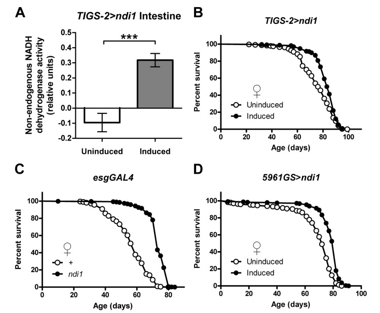 UAS-ndi1 lines [15] were backcrossed 10 times into a w1118 background. TIGS-2 line was provided by L. Seroude, 5961GS was provided by H. Jasper, and esgGAL4 was provided by A. Christiansen. Culturing of flies and measurements of lifespan were performed as previously described [11]. See Supporting Information Materials and Methods for details.