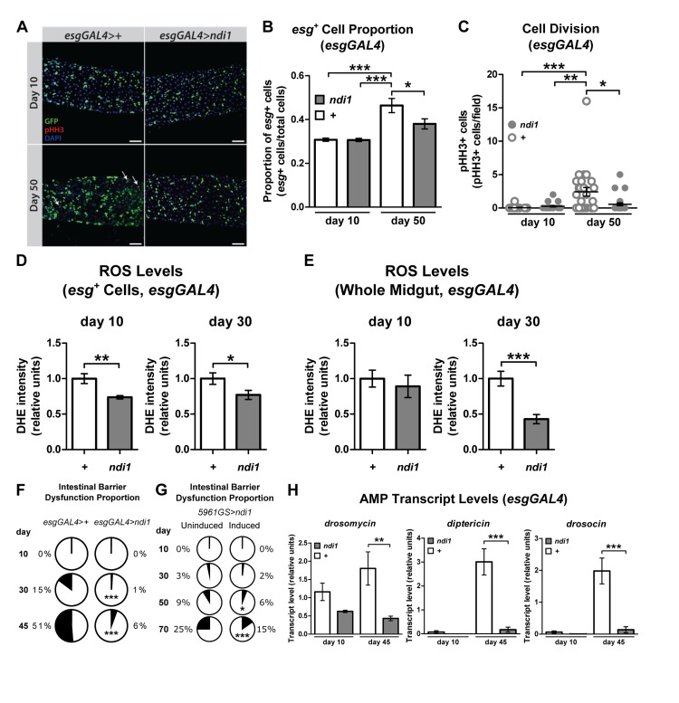 Homeostasis of the digestive tract has been shown to play a central role in lifespan determination in Drosophila [10, 11, 17, 22]. Therefore, we examined markers of intestinal homeostasis in flies that express ndi1 in ISCs/EBs. First, we set out to determine whether ndi1 could delay the onset of markers of ISC proliferation and the accumulation of misdifferentiated ISC daughter cells reported to occur in the aged midgut [8, 9]. Consistent with improved intestinal tissue homeostasis, examination of aged flies that express ndi1 in ISCs/EBs along with an esg reporter (UAS-gfp) revealed a significant decrease in the number of esg positive cells in the midgut relative to controls (Figure 2A-B). In addition, we also observed a delay in the precocious activation of ISC proliferation, as measured by phosphorylation of histone H3 (pHH3), a marker of cell cycle progression through mitosis. Female flies, 50 days post eclosion, expressing ndi1 under the control of esgGAL4 driver contained significantly fewer pHH3+ cells, when compared to controls (Figure 2C). No difference in the number of pHH3+ cells was observed in 10 day old flies, indicating that ndi1 expression specifically delays the age-related increase in ISC proliferation.