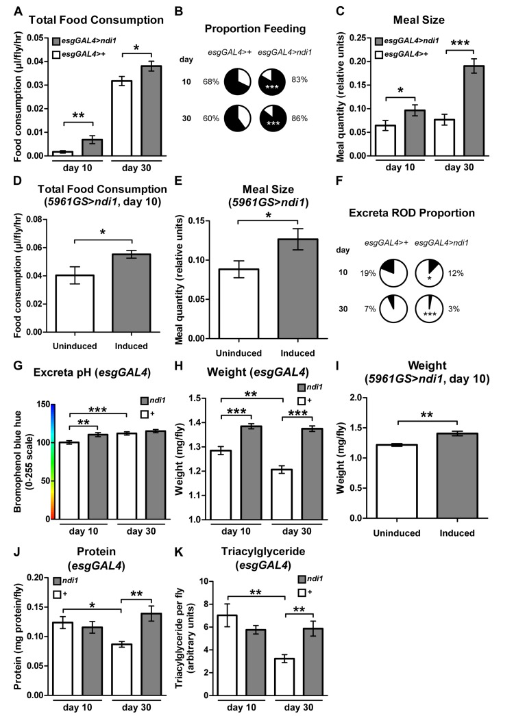 A moderate reduction in food intake, dietary restriction (DR), can extend lifespan in diverse organisms, possibly by reducing the intake of specific nutrients [4]. To determine if a gross difference in food intake could play a role in ndi1-mediated longevity, we assayed feeding behavior in esgGAL4>ndi1 flies and controls. Surprisingly, total food consumption, measured using a capillary feeding (CAFE) assay [27], revealed an overall increase in feeding in flies that express ndi1 in ISCs/EBs at both young and aged time points (Figure 3A). An independent assay of feeding using a modified dye-tracking assay [28] was used to parse the feeding behavior into the proportion of flies that feed within the assay period and the meal size of flies that feed. Expression of ndi1 in ISCs/EBs resulted in significant increases in both the proportion of flies that feed (Figure 3B) and their meal sizes (Figure 3C) in both young and aged flies. 24 hour activity profiles of ndi1 expressing flies are similar to controls, suggesting that an altered activity at different times of day is not responsible for the increased feeding during the assay period (Figure S2K). Moreover, adult-onset expression of ndi1 for 10 days in ISCs/EBs, using the 5961GS driver, was sufficient to confer an increase in total food consumption (Figure 3D) and meal size (Figure 3E). The presence of the inducing drug itself had no significant effect on total feeding (Figure S3B) or meal size (Figure S3C).