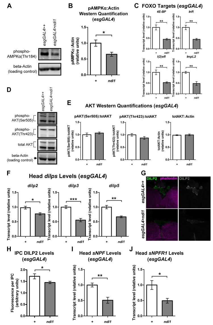 We set out to further characterize the physiology of long-lived ndi1 flies by examining steady state effects of ndi1 expression on systemic nutrient sensitive pathways. AMP-activated protein kinase (AMPK) is a crucial metabolic gauge that is activated by low cellular energy status [16]. Since expression of ndi1 in ISCs/EBs stimulates feeding, we reasoned that these flies may show reduced systemic AMPK activity. Indeed, Western blots specific for phosphorylated AMPKrevealed significantly decreased phosphorylation at Thr184 in whole bodies of esgGAL4>ndi1 flies relative to controls (Figures 4A-B and S4A). AMPK activation has been shown to stimulate sirtuin1 (SIRT1) activity, which deacetylates FOXO and increases its transcriptional activity [30]. Consistent with this, systemic dFOXO transcriptional activity, assayed by measuring transcript levels of multiple direct downstream targets of dFOXO in whole bodies, was significantly decreased in esgGAL4>ndi1 flies (Figure 4C).