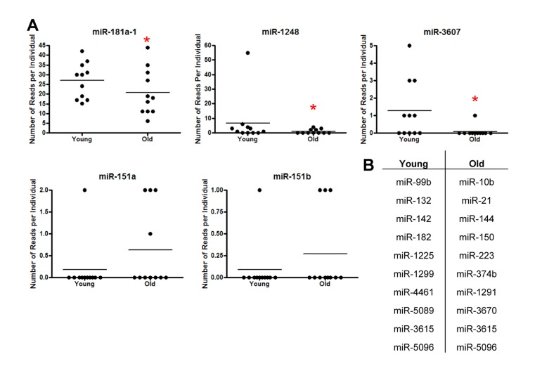 In order to study age-related changes in miRNA expression in human serum, we used Illumina small-RNA next generation sequencing (NGS) technology. We obtained serum from 11 young and 11 old individuals selected from a sub-cohort of the Healthy Aging in Neighborhoods of Diversity across the Lifespan (HANDLS) study. These participants were used in our previous examination of miRNA expression changes with age in PBMCs [14]. Demographic information for these participants is presented in Table 1. Interestingly, miRDeep2 software, which aligns sequences to both mature and precursor miRNAs, revealed that the majority (87%) of miRNA sequences in human serum were precursors. miRDeep2 detected 23 miRNAs in our samples, five miRNAs of which were found to be present in the serum from both young and old individuals (Figure 1A). Importantly, miR-181a-1, miR-1248 and miR-3607 were significantly lower in old individuals (Figure 1A). Several miRNAs had only one read in one individual and thus were excluded from further analysis (Figure 1B).