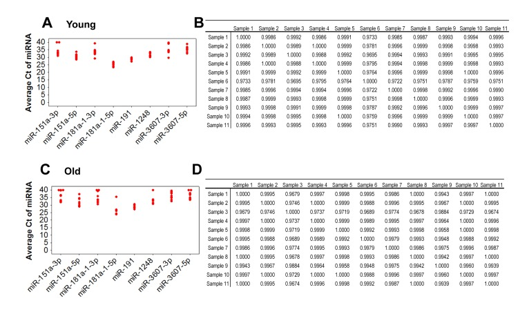 In order to evaluate the variation of miRNA expression among our initial cohort of 11 young and 11 old participants, we analyzed the expression of eight miRNAs in serum using reverse transcription (RT) followed by real-time, quantitative (q)PCR. Expression levels among young and old individuals were consistent with a Pearson's correlation coefficient (r) close to 1 for the all samples (Figure 2). Similar data were also observed with the entire cohort of 40 (data not shown). Comparison of the Ct values for these miRNAs showed low variability among the young and old groups (Figure 2). These data suggest that miRNA expression is reproducibly consistent among young individuals and among old individuals.