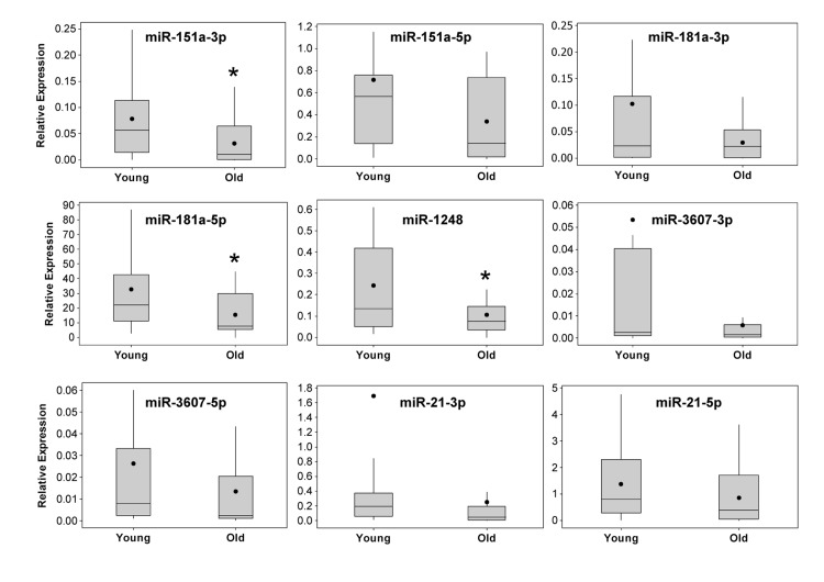 Validation of miRNA expression changes in young versus old individuals