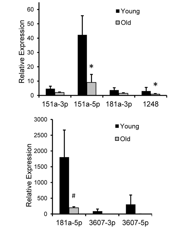 To validate our sequencing results, we employed real-time RT-PCR using sequence-specific miRNA primers to analyze the expression levels of the five miRNAs with the highest number of sequencing reads in our original cohort (n=11 for each group). In addition, we expanded this initial cohort to include more young (n=20; mean age 30.6) and old (n=20; mean age 64.4) individuals. Demographic information for this validation cohort is in Table 1. Three of the miRNAs we analyzed, miR-151a, miR-181a-1 and miR-3607, are precursors that can be processed into two mature miRNAs according to miRBase (miR-151a-3p and −5p, miR-181a-3p and −5p and miR-3607-3p and −5p). Therefore, in our validation experiments, we tested both 3p and 5p mature sequences and also have referred to these miRNAs using the nomenclature in miRBase. In addition, miR-151b has the same sequence as miR-151a-5p and thus, we considered these miRNAs to be the same.