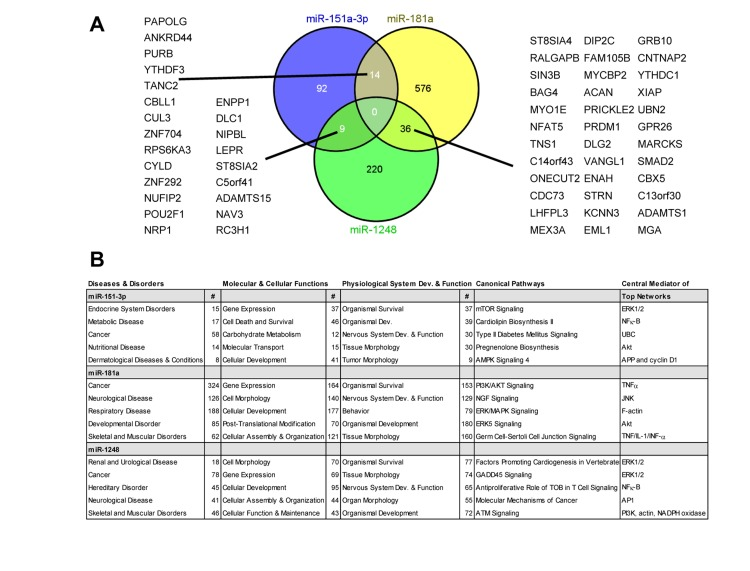 To understand more thoroughly how these miRNAs may contribute to the aging process, we examined several mRNA targets of miR-151a-3p, miR-181a-5p and miR-1248 as predicted using TargetScan 6.2. We identified 115, 626 and 265 mRNAs that were predicted to be targeted by miR-151a-3p, miR-181a and miR-1248, respectively (Figure 5A). No predicted targets overlapped between the 3 different miRNAs, however, there was some overlap between the different combinations of 2 miRNAs (Figure 5A). In addition, we used the targets from TargetScan to input into Ingenuity Pathway Analysis to reveal the top 5 different diseases and disorders, molecular and cellular functions, physiological system development and function, and canonical pathways associated with each miRNA (Figure 5B). We also performed network analysis and listed the central mediator for each of the top five networks (Figure 5B).