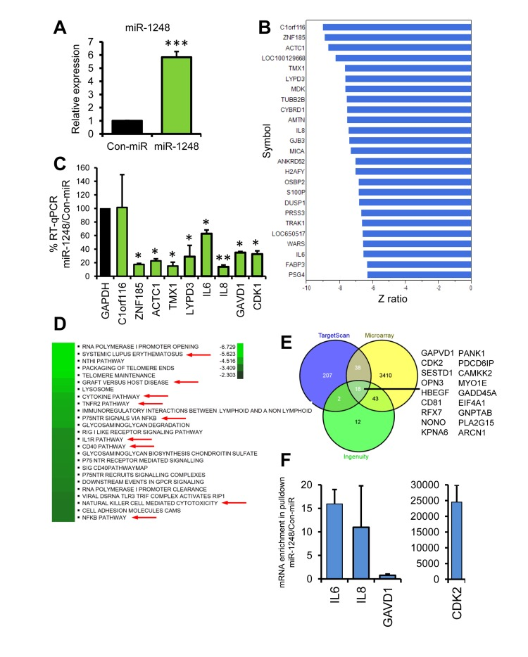 Given that there is very little known about miR-1248, we sought to determine the potential targets and pathways regulated by this miRNA. Therefore, we overexpressed a miR-1248 mimic in HeLa cells and performed microarray analysis in order to determine which genes and pathways are differentially changed by miR-1248 overexpression (Figure 6). This analysis showed that 1740 mRNAs were downregulated and 1770 mRNAs were upregulated by miR-1248 overexpression (Suppl. Table S1). Since most mRNA targets are degraded by miRNAs, we focused on the top downregulated mRNAs from our microarray (Figure 6B). Interestingly, two of these mRNAs are the age-associated cytokines IL6 and IL8. We further validated by real-time RT-PCR that indeed these cytokines are decreased in abundance in miR-1248 overexpressing cells (Figure 6C). In addition, we further validated other genes that were downregulated in our microarray analysis (Figure 6C). Differentially expressed genes and Z ratios were categorized into known canonical pathways by the Parametric Analysis of Gene-set Enrichment (PAGE). The top canonical pathways that were downregulated in miR-1248 overexpressing cells are shown (Figure 6D). All canonical pathways regulated by miR-1248 are shown in the heat map in Supplemental Figure S1. Several cytokine and inflammatory-associated pathways, including NF-κB, are downregulated in miR-1248 overexpressing cells (Figure 6D). Interestingly, DNA repair pathways are upregulated in miR-1248 overexpressing cells (Suppl. Figure S1), suggesting that decreased levels of miR-1248 with age may influence the impaired DNA repair capacity that is observed in older individuals [32]. In addition, the mRNAs that were significantly changed in miR-1248 overexpressing cells were imputed into Ingenuity to obtain a miR-1248 putative target list and compared with targets for miR-1248 in TargetScan. There were 18 genes that overlapped between the 2 algorithms and our microarray data (Figure 6E). Two of these potential targets, GAPVD1 and CDK2, we validated were downregulated in miR-1248 overexpressing cells (Figure 6C). Furthermore, the miR-1248 mimic that we have used for overexpression is biotin labeled. Therefore, we performed biotin-labeled precipitations followed by RNA isolation and RT-qPCR to identify mRNAs bound to miR-1248. We found that CDK2, IL6 and IL8 mRNAs were enriched in our biotin miR-1248 pulldowns; whereas GAVD1 mRNA was not (Figure 6F). These data indicate that miR-1248 can bind to CDK2, IL6 and IL8 mRNAs.