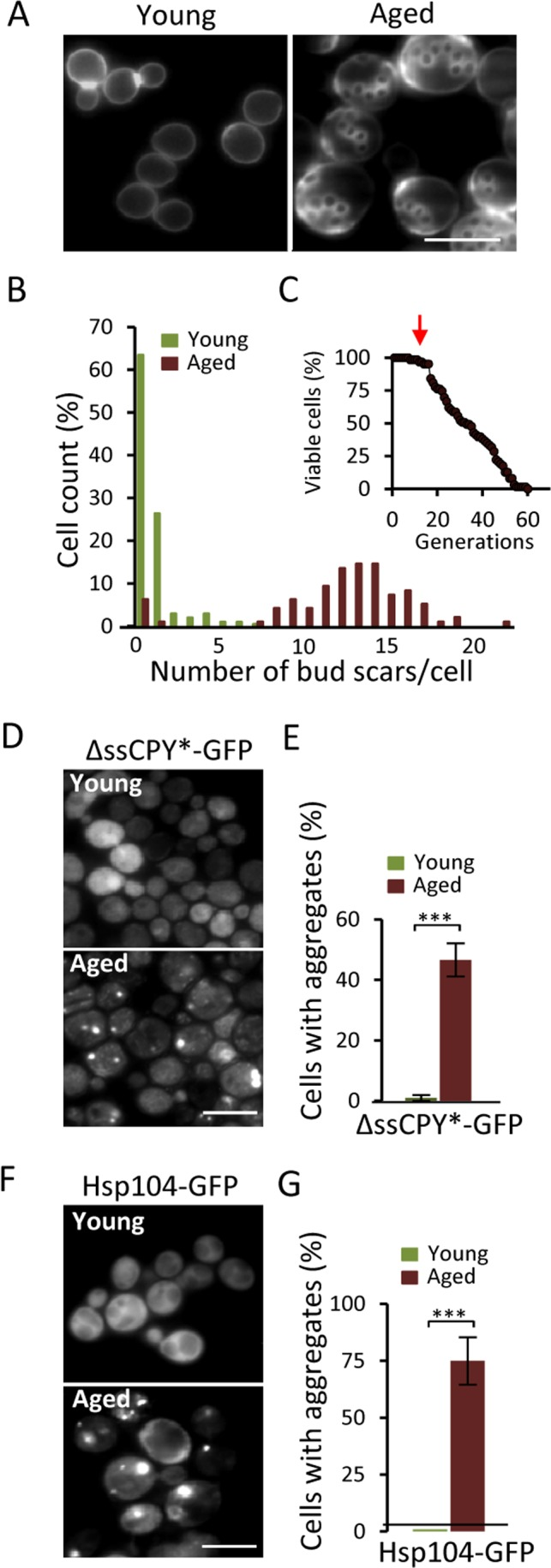 The ΔssCPY*-GFP fusion contains a mutated form of the carboxypeptidase YscY that misfolds in the cytoplasm but is rapidly degraded by the UPS [20]. We used this protein construct to test if aging of yeast mother cells might lead to defects in UPS functions, which would result in the accumulation of misfolded ΔssCPY* and its aggregation. Streptavidin-biotin magnetic sorting (see Materials and Methods) was used to obtain replicatively aged cells of an average age of 13-15 generations (Fig 1A&B). These cells have not yet started to die off but show signs of aging (Fig 1C). As shown in figures 1D&E, there is a dramatic increase in ΔssCPY*-GFP aggregate formation in these aged cells: While no aggregates could be detected in young cells, 50% of the aged cells harbored ΔssCPY*-GFP foci (Fig. 1E). Using Hsp104-GFP, the protein disaggregase acting together with Hsp40/70 [19], as a reporter for protein aggregates [19, 21] confirmed that these aged cells suffer from extensive aggregate formation also of indigenous proteins (Fig 1F&G).