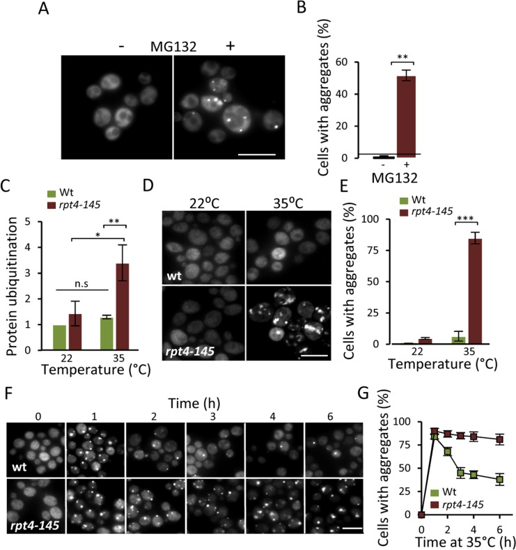 The results obtained (Fig. 1) raised the possibility that the accumulation of aggregates in aged cells is caused by a failure of the UPS system to properly clear-out misfolded proteins. To approach this possibility, we first tested if there is an increase in Hsp104-GFP foci when artificially lowering the proteasomal activity in a growing culture of predominantly young cells. Indeed, addition of the proteasomal inhibitor MG132, resulted in the immediate accumulation of Hsp104-GFP associated aggregates (Fig 2A&B). In addition to restricting proteasome function chemically, we used the temperature (ts) strain rpt4-145; Rpt4 is one of six ATPases of the 19S regulatory particle necessary for proper UPS function [22]. When growing the rpt4-145 strain at a near non-permissive temperature (35°C), the level of ubiquitinated proteins increased 3-fold compared to wt and growth at the permissive temperature (22°C) (Fig 2C) confirming that rpt4-145 indeed has a defect in proteasome function at the temperature tested. Moreover, Hsp104-GFP foci accumulated when the cells were grown at 35°C (Fig 2D&E) demonstrating that an unperturbed proteasome activity is necessary to prevent aggregate formation in young cells. We next tested if functional proteasomes are required also for the clearance of the aggregates once formed. To accomplish this we induced aggregate formation by switching the growth temperature from 22°C to 35°C and monitored aggregate clearance over time. After an initial surge in aggregate formation, which occurred to a similar extent in both wt and rpt4-145 cells upon the heat stress, aggregates formed in the wt strain were resolved at a markedly higher rate (Fig 2F&G). The data indicate that proteasome activity is necessary both for preventing aggregate formation in young cells and for the efficient clearance of stress-induced protein aggregates.