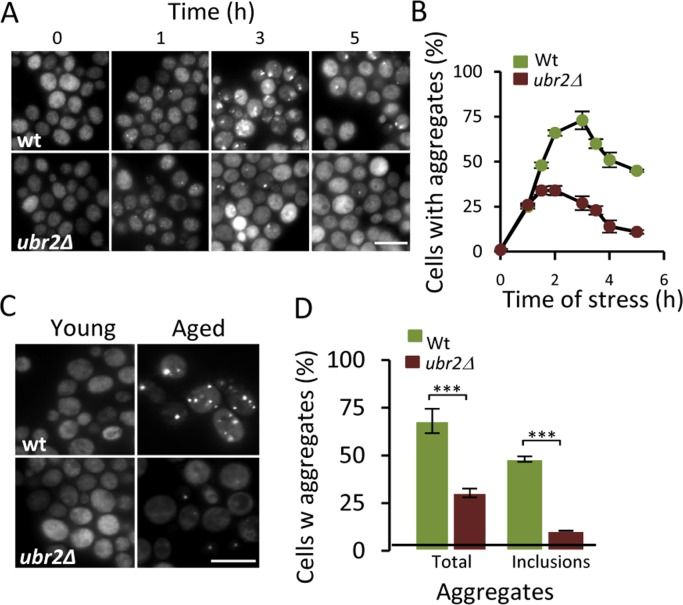 To further test if there is a link between the UPS and protein aggregation, we tested the effect of increasing proteasome activity on Hsp104-GFP foci formation by deleting UBR2. Loss of the E3 ubiquitin ligase Ubr2 stabilizes the transcription factor Rpn4, which is a positive regulator of genes encoding proteasomal subunits [23] - increased Rpn4 levels leads to more proteasomes and elevated proteasome capacity [16]. To determine if the proteasome is a bottleneck for aggregate management, we induced aggregates by hydrogen peroxide exposure (0.6 mM) and found that the ubr2 mutant displayed 50% lower levels of Hsp104-GFP foci compared to wt (Fig 3A&B) indicating that elevating proteasome capacity helps in preventing aggregate formation. We wondered whether age-induced aggregation was similarly affected by boosting proteasome production and found that aged cells lacking Ubr2 displayed markedly less Hsp104-GFP foci and large Hsp104 associated inclusions (Fig 3C&D). These data suggest that the UPS may be limiting for proper protein quality control during cellular aging leading to aggregate formation.