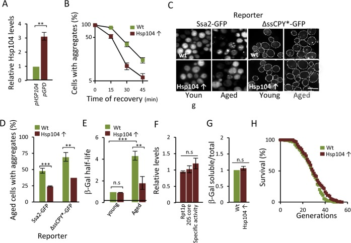 The fact that (i) a modest reduction, chemically or genetically, of proteasome activity leads to aggregate formation already in young cells, that (ii) boosting proteasome levels/activity diminishes aggregate formation in aged cells, and that (iii) a substrate (ΔssCPY*) for the proteasome accumulates as aggregates during aging, suggest that UPS is a key factor in protein homeostasis that becomes limiting in aged yeast cells. To test this more directly, a ubiquitinated β-galactosidase (ub-Pro-βgal) was used as an in vivo substrate for the 26S proteasome. We found that while this substrate was efficiently degraded in young cells, aged cells failed to do so (Fig 4A). This failure of aged cells to degrade ub-Pro-βgal was not associated with an apparent diminished abundance of proteasomes, as shown in Fig 4B. Moreover, the proteasome capacity of aged cells was not reduced, as analyzed by the processing of Suc-LLVY-AMC in protein extracts (Fig 4C). Thus, proteasomes do not appear to be non-functional and terminally damaged in aged cells. Nevertheless, it appears that the proteasomes are prevented from functioning properly in vivo, possibly by insoluble/aggregated proteins interfering with proteasome functions. In support of this, we found that the localization of a proteasome subunit (Rpt6-GFP) was redistributed from being predominantly nuclear in young cells to become increasingly associated with extra-nuclear granular structures during aging (Fig. 4D). To test the hypothesis that aggregates obstruct UPS function in aged cells, we incorporated a genomic HSP104 controlled by the strong GPD promoter to elevate disaggregase activity. This recombinant construct displayed an elevated level of Hsp104 (Fig 5A) and a more rapid clearance of stress-induced aggregates as analyzed using the chaperone Hsp70, Ssa2-GFP, as a reporter (Fig 5B). We then tested if elevated Hsp104 levels resulted in altered protein aggregation in aged cells. Indeed, the accumulation of Hsp70-associated aggregates and ΔssCPY*-GFP inclusions upon aging were decreased by overproducing Hsp104 (Fig 5C-D).