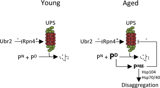 Previous reports have shown that accumulation of protein aggregates of model disease proteins of human neurological disorders impairs the functional capacity of the UPS [24-27] but to what extent aggregation of indigenous proteins is causing a decline in UPS performance during aging has not been shown. Herein, we report evidence for that UPS activity is declining during replicative aging of yeast mother cells and that this decline is intimately linked to protein aggregation interfering with UPS performance. Specifically, we show that elevated disaggregate activity restores UPS-dependent degradation in vivo in aged cells without elevating UPS levels.