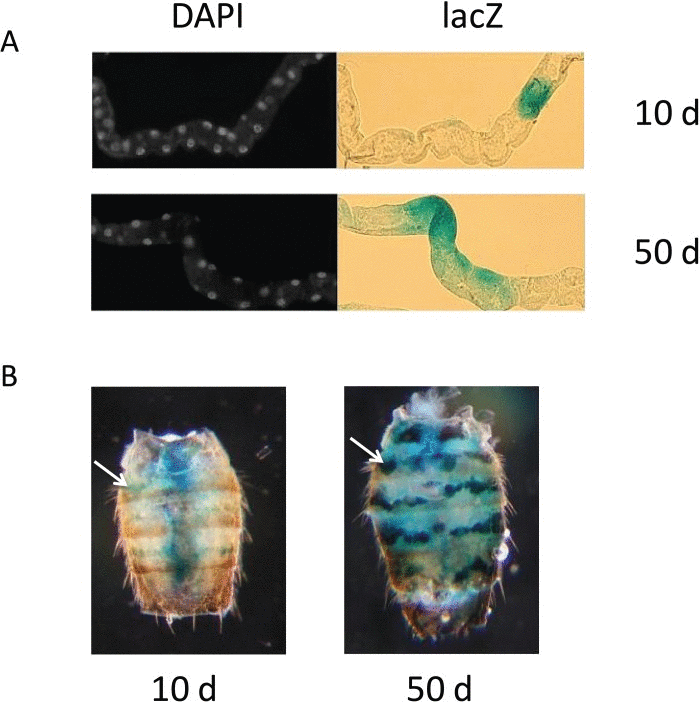We selected three distinctly different tissue types with ready accessibility to X-gal in whole mount preparations, and sufficient optical clarity to allow us to count individual stained and unstained cells in whole mount preparations. These included: Malpighian tubules (renal system), oenocytes (nutrient storage, pheromones) and the cells at the root of the major dorsal thoracic bristles (neuronal sensory and bristle support cells). Malpighian tubules, with their tubular, linearly aligned arrangement of cells, permit ready counting of individual lacZ-expressing cells as a percent of all cells present in the tubule, when these are visualized by a DAPI nuclear stain (Fig. 1, S1). Malpighian tubules have the additional distinction of being one of the few somatic tissues in the adult fly for which there are active stem cells and replacement of Malpighian tubule cells throughout adult life [29]. Oenocytes, with their linear and segmentally arranged distribution in the fly abdomen, can be easily counted with X-gal staining, as individually lacZ positive or negative, directly through the abdominal cuticle (Fig. 1, S1). The 10 major thorax bristles selected for counting (two pairs of dorsocentral setae, two pairs of postalar setae, and one pair of anterior scutellar setae) permit direct visualization of the cells at the root of their bristles, through the cuticle of the dorsal thorax.