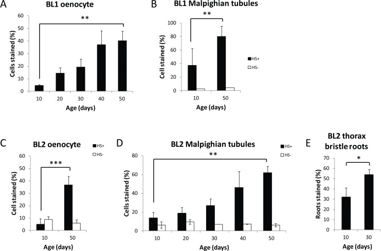 The level of cell-specific gene silencing with age was quantified by counting the number of lacZ-expressing cells as a percentage of total cells in each specific tissue. After heat shock, young 10-day old flies ranged from 5-35% of cells positive for lacZ expression in the Malpighian tubule, oenocytes, or thoracic bristle roots in the two different PEV lines, while similarly-treated 50-day old flies show between 40-80% lacZ expression in Malpighian tubule or oenocytes for BL1 and BL2 (Fig. 2). At present, the thoracic bristle cells can only be evaluated up to day 30, as visualization of lacZ expression in these cells is obscured by the age-associated increase in expression of the HS-lacZ reporter in the underlying thoracic muscles that is seen by day 30. Together, these data document the dynamic change in age-related loss of gene silencing in two different heterochromatin regions, 3L and Y heterochromatin.