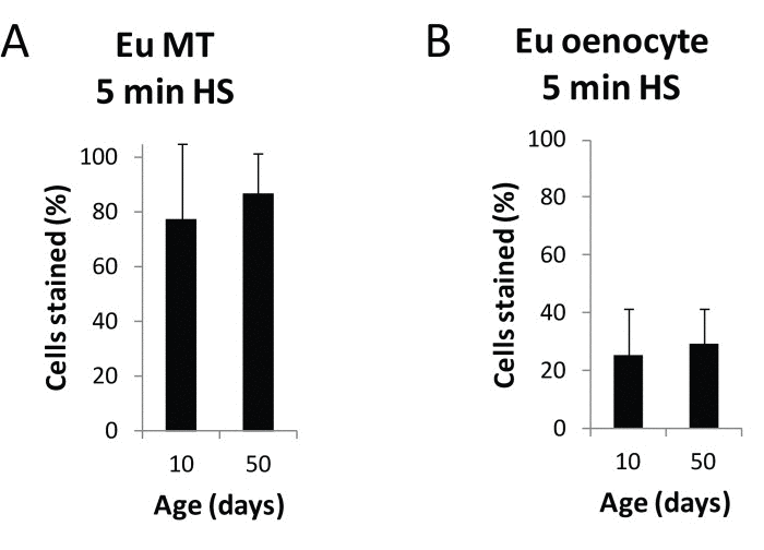 To examine the possibility that the increase in lacZ expression with age could be caused by an age-related increased sensitivity of the HS promoter to heat shock, we examined the effect of age on the euchromatin control line, in which the reporter construct is free of the confounding effects of heterochromatin repression. We found no significant difference in lacZ staining with age in Malpighian tubules or oenocytes after a brief heat shock for the euchromatin control line (Fig. 3).