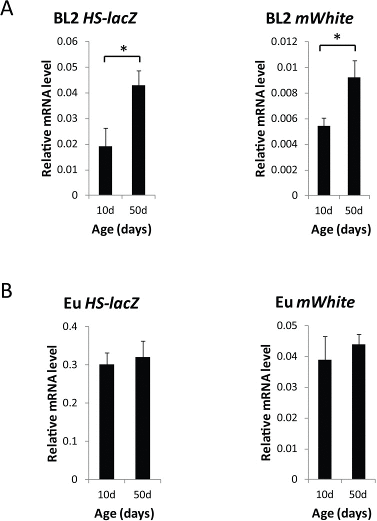 In addition to determining loss of gene silencing at the level of single cells in specific tissues of individual flies, we examined gene silencing with age globally, by measuring mRNA expression from the HS-lacZ gene and the mini-white gene that make up the PEV reporter construct [27, 28]. We found a two-fold increase in HS-lacZ (after heat shock) and mini-white (without heat shock) mRNA expression with age, demonstrating that for two different promoters, HS-lacZ and white minigene, both repressed by heterochromatin, there is a loss of silencing with age (Fig. 4). There is no change in level of mRNA expression for the HS-lacZ (after heat shock) or white minigene (without heat shock) when the reporter construct is in euchromatin (Fig 4). The finding of a two-fold increase in HS-lacZ and white minigene mRNA expression with age for the heterochromatin-positioned reporter further shows that in a variety of tissue types, there is a loss of gene silencing with age in heterochromatin regions.