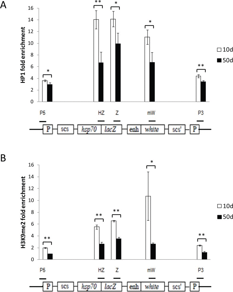 Primers: P5-F: TACTTCGGTAAGCTTCGGCTATCG; P5-R: CGTGTCACACTAGAATCTTCA; HZ-F: GAAGAACTCACACACAATGCC; HZ-R: AAGGGGATTAAGTTGGGTAACGCC; Z-F: TGCGGGACGCGCGAATTGAATTAT; Z-R: AGATGGCGATGGCTGGTTTCCAT; mW-F: GGTAGCTGTGCTCGCTATATAAGACA; mW-R: ACGAAGTATCCTACGAAGTAGGTTTA; P3-F: ACGTTAAGTGGATGTCTCTTGCCG; P3-R: GCAGGTTGCCCAAGAAGATTCGAC; CTRL1-F: GCCCTGGTGGAAGTGGAAATTGAA; CTRL1-R: GGCTCAGAAACAGAAGCAGGAACA; CTRL2-F: TAGAAAGATCTGAGGAGAGTCCGCCT; CTRL2-R: TAACATGGCCCTCGGCTACGATTT. CTRL1 is at chromosome position: 3L: 22341700 and CTRL2 is at chromosome position: 2L: 13168600. Enrichment for target sites and euchromatic control sites in ChIP DNA relative to input was determined by qPCR (SYBR Green PCR Master Mix, Applied Biosystems). The fold enrichment was derived from ΔΔCt between each target site and the average of the two control sites.
