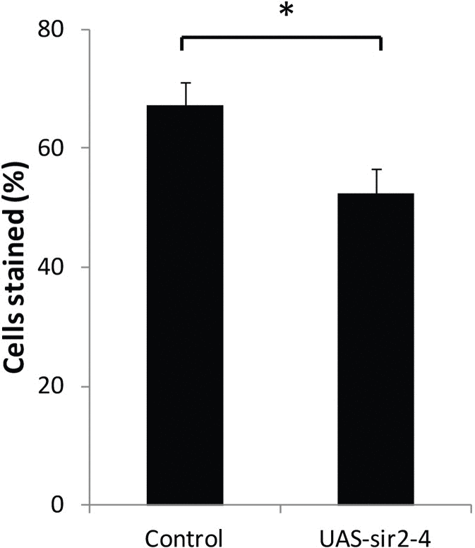 The two PEV lines, In(3L)BL1 (BL1) and Tp(3;Y)BL2 (BL2), and the euchromatin control line P[w+ HS-lacZ] (65E) (Eu) were a gift from Joel C. Eissenberg and are described in [27, 28]. The Sir2 UAS-Sir2-4 transgenic line was backcrossed to a w1118 control line for 10 generations [31]. Flies were grown and kept at 25 °C on standard cornmeal food (approximately 12% sucrose, 3% yeast, 5% corn meal, and 1% agar). For studies on dietary restriction, after eclosion, flies were grown on either high calorie 1.5N (1.5N: 15% sucrose, 15% yeast, 5% corn meal, 2% agar), or low calorie (0.5N: 5% sucrose, 5% yeast, 5% corn, 2% agar) food, similar to [38].
