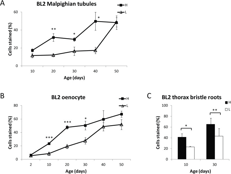 The percent of stained oenocytes was determined from days 20-50 by counting lacZ-stained and total brown-pigmented oenocytes in the six dorsal-abdominal segments. Brown-pigmentation is seen by day 20 in BL1, BL2 and control flies. The total number of oenocytes days 2-10 was shown to be the same as days 20-50 by counting the number of lacZ-expressing oenocytes in the control line after heat shock days 2-50 (no significant difference was seen with age) and comparing with the number of brown-pigmented oenocytes in unstained cohorts of control, BL1 and BL2 flies at days 20-50 (no significant differences with age or line). Therefore, the percent lacZ staining for the Day 2-10 was determined by counting the number of lacZ-stained oenocytes in the six dorsal-abdominal segments and comparing them to a “standard” number of oenocytes in each segment: 1=19, 2=22, 3=24, 4=24, 5=20, and 6=18 cells +/− 1.5 cells/segment.