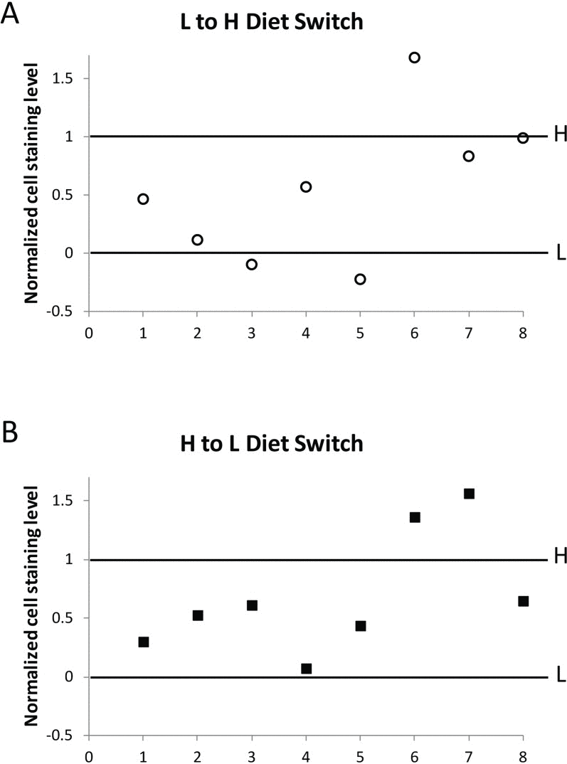 To illustrate the change following diet switch for each of the eight biological replicates, we plotted the percent of lacZ expression in oenocytes for flies switched from low calorie to high calorie food, or from high calorie to low calorie food, as a percent of the total difference between the lacZ expression value for flies living continuously on high calorie food (1.0), and the value for flies living continuously on low calorie food (0), for each of the biological replicates (Fig. 8). We performed two-sided chi square analyses on the individual replicates as well as on the pooled data, using the raw counts of the number of positive cells and negative cells within the context of a binomial comparative trial model to determine whether the change in the level of gene silencing for the switched flies is in the same direction as the level of gene silencing for flies fed continuously on the diet to which they were switched. Analysis of the pooled data showed a statistically highly significant change away from the level of gene silencing of the food they had been living on (P<0.005) and toward the level of gene silencing they were moved to. Analysis of the individual replicates showed that for those flies moved from high calorie to low calorie food, 6 of the 8 replicates exhibit a statistically significant change in gene expression away from the level of gene expression of flies on high calorie food (P≤0.02) while 6 of the 8 replicates moved from low calorie to high calorie food exhibited a statistically significant change in gene expression away from the level of gene expression of flies on low calorie food (P≤0.05). The finding that flies at 20 or 30 days of age can rapidly (within 72 hours) respond to a change in diet by altering the level of gene silencing of a PEV reporter gene, a direct functional measure of the state of repressive heterochromatin, suggests a close relationship between the life span-extending intervention CR, and maintenance of repressive heterochromatin. Furthermore, the rapidity of the response to diet seen in the change in gene silencing demonstrates the epigenetic plasticity of chromatin during aging and the potential role of diet and metabolism in chromatin maintenance.