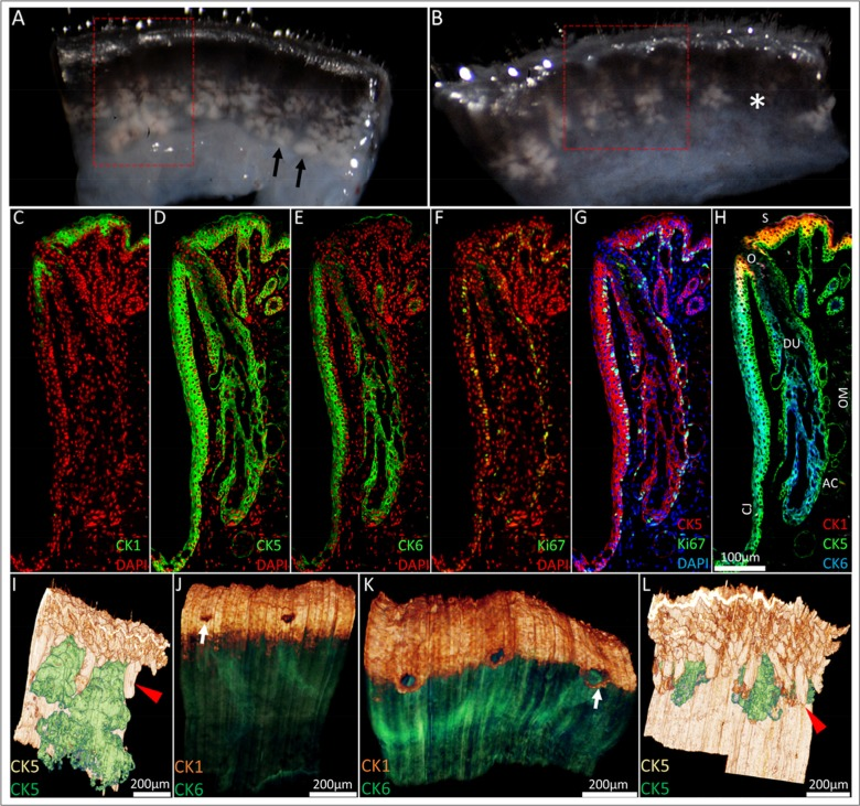 Prior to BMMA embedding and immunofluorescence staining to compare the effects of aging, excised eyelids from a 5-month and 2-year old mouse were imaged under a dissecting microscope at 43× magnification (Fig. 1A and B, respectively) and the meibomian glands were identified as a whitish tissue underlying the palpebral conjunctiva (black arrows). Loss of lipid containing acinar tissue consistent with meibomian gland dropout was observed in the 2-year old (Fig 1B, asterisk) and not the younger 5-month old mouse eyelid tissue. Next, BMMA serial sections cut at 2μm were sequentially immunostained with CK1, 5, 6 and Ki67 and 0.64mm × 1.14mm × 1.25mm of the 5-month old mouse eyelid (Fig 1A, red box) and 0.58mm × 0.80mm × 1.1mm of the 2-year old mouse eyelid (Fig 1B, red box) were 3-D reconstructed by ICT protocol. The typical CK1, 5, 6 and Ki67 immuno-staining patterns of a young mouse eyelid are shown in Figure 1C-H. In the 5-month old mouse eyelid CK5 reconstruction (Fig. 1I), meibomian glands (green) are in close proximity to each other and sit between regularly organized eyelash cilia (red arrowhead). At the lid margin (Fig. 1J), CK1+ cells of the epidermis (orange) define the mucocutaneous junction as the transition to CK6+ conjunctiva (green) posterior to meibomian gland orifices (white arrow). In contrast, ICT of the 2-year old mouse eyelid reveals migration of the mucocutaneous junction to the level of meibomian gland orifices (Fig. 1K, white arrow). We also observed prominent truncation or atrophy of meibomian glands in the old lid (Fig. 1L). These glands have become largely obscured from view by eyelash cilia and are positioned much further apart from each other compared to the younger lid.