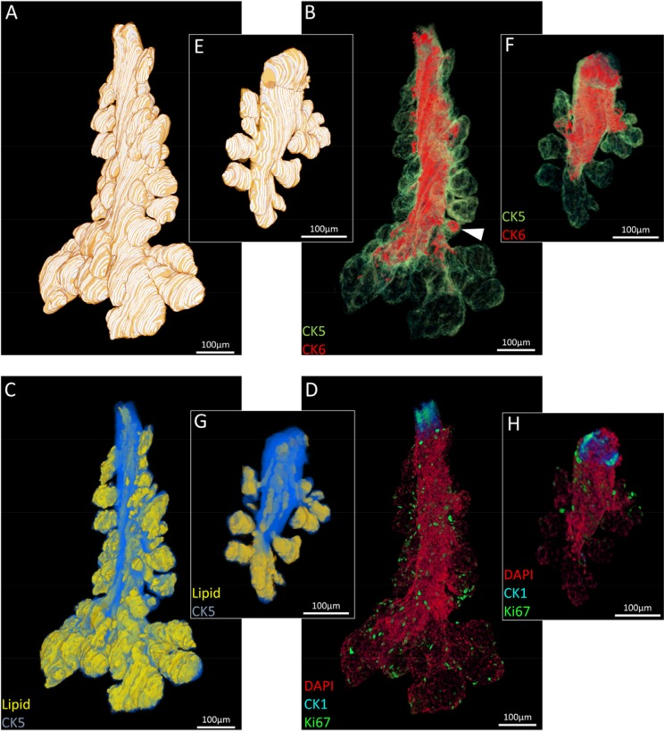 Three meibomian glands were segmented from each eyelid reconstruction for visualization (Fig. 2) and quantification (Fig. 3) of total gland, ductal and lipid volumes as well as quiescent and proliferative cells. The 5-month old mouse meibomian glands (Fig. 2A-D) are comprised of multiple, large acini branching from a long tubular central duct characterized by a CK6+ epithelium (Fig. 2B). There are instances where CK6+ cells extend into an acinus (Fig. 2B, white arrowhead), implying that, in some cases the ductule, or terminal ends of the ductal epithelium, can form a significant component of an acinus. Acini are composed of terminally differentiated meibocytes filled with lipid (Fig. 2C) and Ki67+ cycling cells in the peripheral basal layer (Fig. 2D).