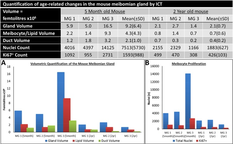In comparison, an aged meibomian gland (Fig. 2E-H) had distinct shortening from the distal end and a marked loss in glandular and ductal volume (Fig. 2F) which reveals both ductal and acinar atrophy. Moreover, there is a visible reduction in the CK6+ ductal component of the gland (Fig. 2F). There is a clear loss in acinar tissue and acini appear noticeably smaller when compared to the younger glands (Fig. 2G). Ki67+ nuclei count is also largely reduced in the older meibomian gland and correlates with the loss of tissue and total cell number (Fig. 2H). The reduction of total gland, lipid and ductal volume (Fig. 3A), as well as a loss of quiescent and cycling cells (Fig. 3B) in the meibomian gland with aging was confirmed by ICT quantification.