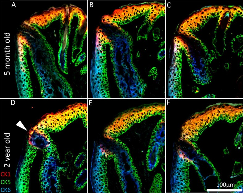 To assess whether hyper-keratinization of the meibomian gland duct and excretory orifice is associated with ARMGD in mice, ICT was specifically performed with CK 1, 5 and 6, markers for epidermis, all epithelium and meibomian gland duct/palpebral conjunctiva, respectively. In the young mouse eyelid, CK1 expression is limited to the suprabasal layer of the epidermis and extends posterior to the orifice of the meibomian gland (Fig. 4A-C). In older mice, hyper-keratinization of the duct and excretory orifice is not evident and does not correlate with glandular atrophy seen here. CK1 expression is less prominent at the lid margin resulting in an anterior shift of the mucocutaneous junction (Fig. 4D-F). In addition to lid margin changes, there are cases of meibomian gland orifice abnormalities in the form of CK5+/CK6+cell plugs (Fig 4D, white arrowhead).