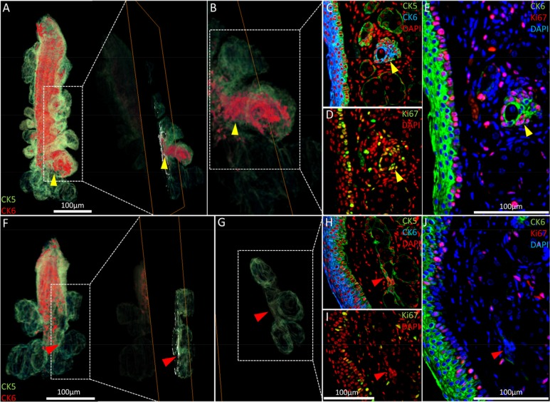 As shown previously (Fig. 2B, white arrowhead), acini of the 5-month old meibomian glands may have an enlarged CK6+ epithelial component not readily apparent in meibomian glands reconstructed from the 2-year old mouse. Reverting to the same regions in the high-resolution 2-D images that constitute the reconstruction (Fig. 5A-E, yellow arrowheads), we found increased cell cycling when compared to the average acinus (Fig. 5D and E). These ‘nascent’ acini which contain a CK6+ ductal component contain fewer terminally differentiated meibocytes than acini with little or no CK6. Notably, no acini with a significant CK6+ ductal component were observed in the 2 year old meibomian gland (Fig. 5E-J). In the older glands, the ductal epithelium is truncated and the transitional regions between ductal and acinar epithelia show few cycling cells (Fig. 5H and J).