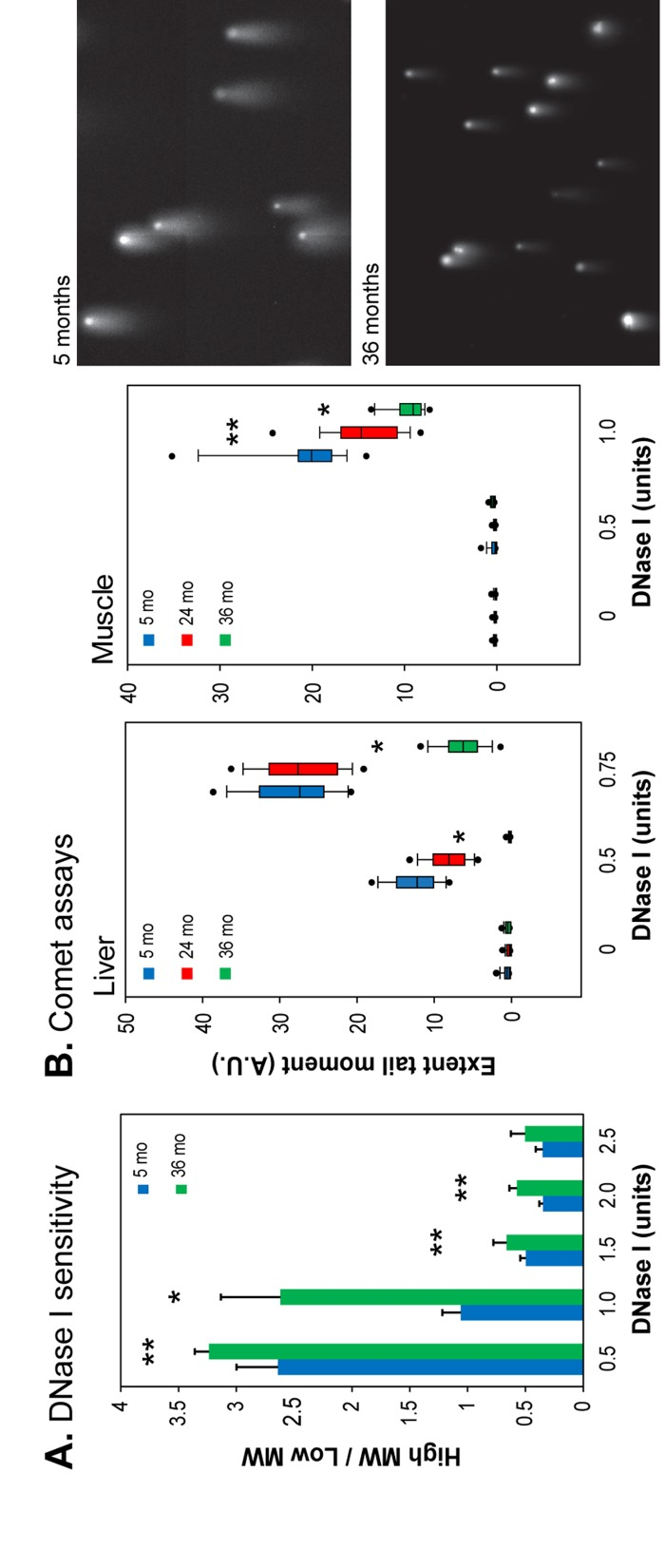 Skeletal muscle nuclei showed the greatest increase in heterochromatin-associated proteins with age, in both mouse and baboon [26]. To determine if skeletal muscle undergoes a similar decrease in chromatin accessibility with age as seen in the liver, nuclei isolated from young (5 month), old (24 month), and very old (36 month) skeletal muscle were subjected it to DNase I digestion and analyzed using the Comet assay. As seen in liver, skeletal muscle nuclei showed increased resistance to DNase I digestion with age, as indicated by the smaller extent tail moment. The 36 month old animals displayed the highest degree of resistance to DNase I (Figure 1B, Supplemental Figure 2B). These results indicate that age-associated chromatin rearrangements, leading to a more nuclease resistant (and presumably more compact) state, occur also in terminally differentiated, postmitotic tissues.