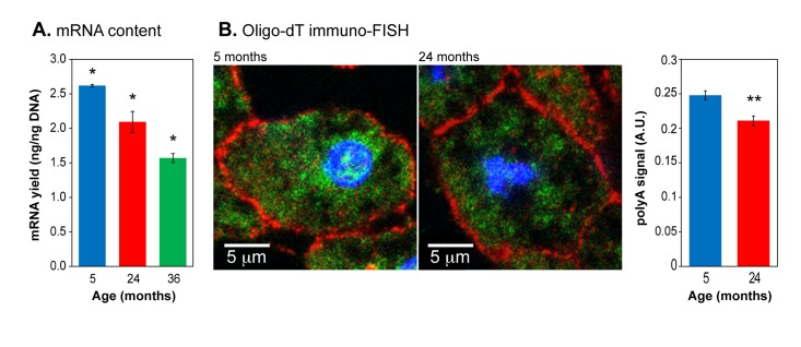 An overall increase in heterochromatin should be reflected by a commensurate decrease in RNA production. We therefore quantified the amount of mRNA in liver tissue of mice of varying ages. Using a biochemical purification based on polyA selection we found a decrease of 20% at 24 months which increased to almost 2-fold (42%) at 36 months (Figure 2A). To confirm that these results were not affected by systematic changes during the extraction procedure, we used a different method of mRNA quantification, fluorescence in situ hybridization (FISH) with oligo-dT probes (Figure 2B, Supplemental Figure 3). We found a decrease of 10% at 24 months. These data were acquired by imaging large numbers of nuclei and are statistically significant. It is well known that patterns of gene expression change profoundly with age in a complex and tissue-dependent manner, with both upregulation and downregulation taking place at the individual gene level. The results presented here do not contradict these observations, but in addition indicate that overall steady-state mRNA pools decrease with age, an effect that becomes especially pronounced at very advanced age. To our knowledge this age-associated trend has not been noted before, and agrees closely with the increasing hetero-chromatinization.