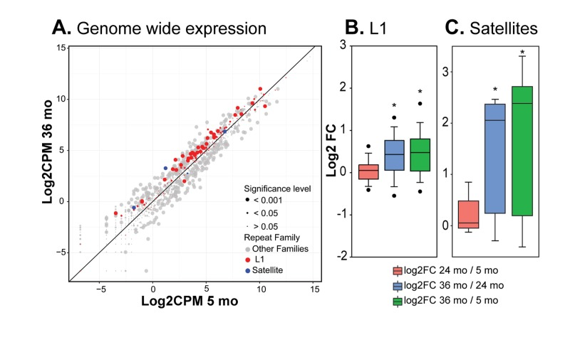 Satellite elements (SEs) consist of seven different subfamilies of repetitive sequences in the mouse. SEs, which do not transpose, are localized mostly in the centromeric, pericentromeric and telomeric regions of the genome comprising a significant fraction of cellular constitutive heterochromatin. Even though SEs are in a repressed state, they are transcribed at low levels during development, differentiation and in response to stress, and the transcripts may be an important component of kinetochore assembly [28]. SEs became prominently derepressed in HDF after entry into senescence [25]. The RNA-seq analysis showed that likewise the majority of SE subfamilies became derepressed in mouse liver, with the largest changes occurring between 24 and 36 months (Figure 3C).
