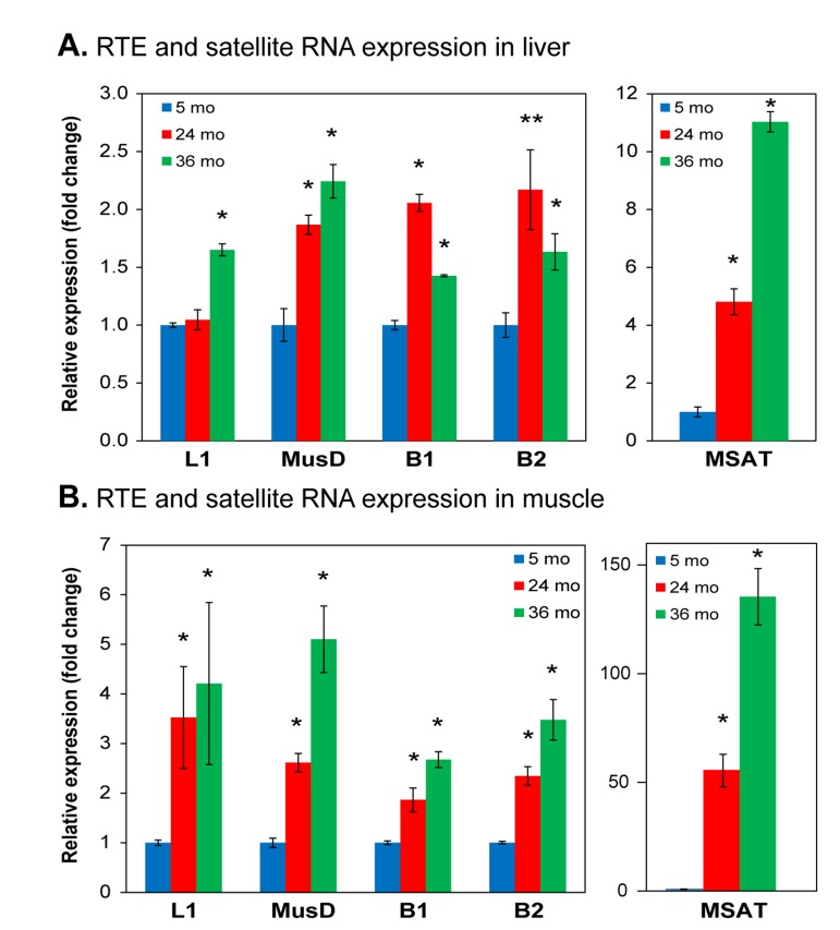 To reinforce and extend these bioinformatic data, as we had done in our studies of HDF [25], we turned to direct quantitative RT-PCR analysis (qPCR) of representative RTE subfamilies of interest. While in humans the only RTEs that are autonomously active are the L1 LINEs, several subfamilies of LTR RTEs are active in the mouse genome [29]. Hence, in addition to L1s, which are the most abundant active RTEs, we investigated the LTR RTEs MusD/ETn, which our RNA-seq data indicated were activated with age. SINEs (such as Alu in humans) are non-autonomous, but can be mobilized by L1 in trans. Since SINE transcripts are not polyadenylated, and hence were not well represented in our RNA-seq dataset, we also examined B1 and B2, the two major SINE families in the mouse genome. Finally, we also assessed the major pericentromeric SEs MSAT. In liver L1 RNA was unchanged at 24 months and showed a statistically significant increase at 36 months (Figure 4A). MusD, B1 and B2 showed an increase at 24 months and either a further increase (MusD) or small drop (B1, B2) at 36 months. MSAT showed a strong increase (5-fold) at 24 months and a further increase (11-fold) at 36 months. Using the same primers we found even more pronounced increases in muscle (Figure 4B), where in all cases RNA expression increased at 24 months with further increases at 36 months (MSAT showed a remarkable 90-fold increase at 36 months).