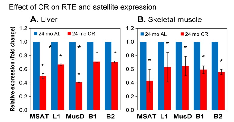 CR is a dietary intervention known to increase lifespan in a wide range of organisms from invertebrates to mice [30]. It is accomplished by the reduction of caloric intake to approximately 60% of a healthy diet without malnutrition. Even though it was recently reported that the ability of CR to increase the lifespan of non-human primates is somewhat ambiguous, it was shown to significantly increase the healthspan (the proportion of lifespan free of age-associated diseases and frailty) of these animals [31,32]. We compared RTE expression in liver and skeletal muscle from ad libitum fed (AL) and CR mice at 24 months of age, and found that for all elements examined the RNA levels were significantly decreased in CR animals (Figure 5). We also examined the effect of CR on the transcription pericentromeric SEs. As seen with the RTEs, the upregulation of their transcription was attenuated in 24 month CR animals (Figure 5), indicating the calorie restriction also delays the loss of constitutive hetero-chromatin in centromeric regions. Hence, chromatin reorganization and activation of RTEs are not simply the result of stochastic events that correlate with chronological time, but are causally affected by mechanisms that regulate the rate of aging.