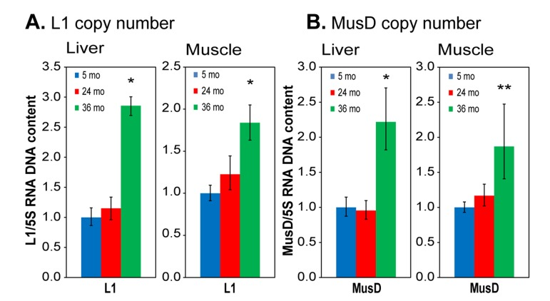 We recently reported that RTEs become derepressed and start actively transposing during replicative senescence of human fibroblasts in cell culture [25]. In this communication we extend these studies to the investigation of aging mouse tissues.