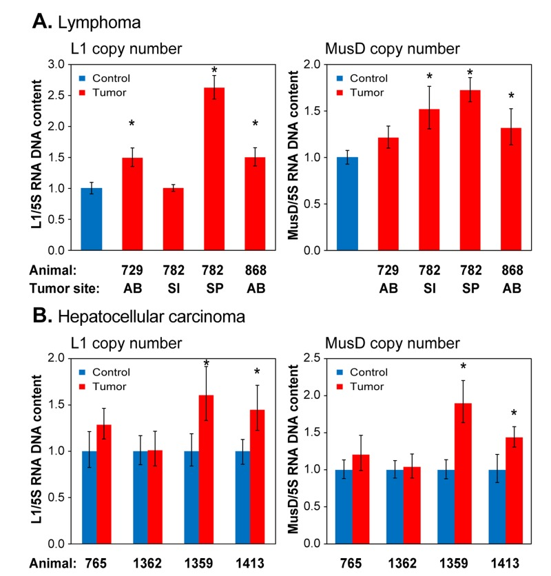Novel transposition events have recently been documented in several human cancers [34]. We therefore examined naturally occurring tumors, which in the C57 strain of mice are primarily lymphomas and hepatocellular carcinomas (HCC), for evidence of RTE mobilization. We found widespread increases in copy number of both L1 and MusD elements, in both lymphoma (Figure 7A) and HCC (Figure 7B). Not all animals showed copy number increases in their cancers, and L1 and MusD copy numbers did not always increase in concert. In comparison to the normal age-associated increases in transposition in the liver (Figure 6), as well as relative to uninvolved tissue in the same animal, it is clear that mobilization of RTEs is significantly increased in HCC.