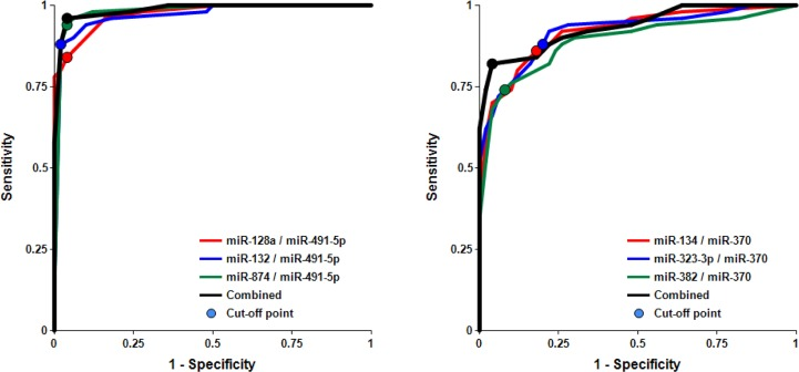 The concentrations of 8 miRNAs were measured by RT-qPCR analysis in plasma samples from 50 MCI patients and 50 AMC subjects (Table 1). The ratios for miRNAs from the miR-132 family to miR-491-5p and for miRNAs from the miR-134 family to miR-370 (2−ΔCt) are presented as box-plots in Fig. 1 and 2, respectively. Fig. 3 presents Receiver-Operating Characteristic (ROC) curves for miR-132 and miR-134 families. The area under the ROC curve (AUC) for miR-128/miR-491-5p, miR-132/miR-491-5p and miR-874/miR-491-5p is 0.97, 0.97 and 0.98, respectively. These biomarker pairs (Set 1) differentiated MCI from AMC with 84%-94% sensitivity and 96%-98% specificity (Table 2). Further, biomarker pairs miR-134/miR-370, miR-323-3p/miR-370 and miR-382/miR-370 (Set 2) demonstrated 74%-88% sensitivity and 80-92% specificity (Table 2). AUC for miR-134/miR-370, miR-323-3p/miR-370 and miR-382/miR-370 are 0.92, 0.92 and 0.89, respectively. Combining biomarker miRNA pairs within the same set further improves sensitivity and specificity (Fig. 3 and Table 2). Combining biomarker miRNA pairs from miR-132 and miR-134 sets results in sensitivity and specificity that range between values obtained for the two sets of biomarker pairs.