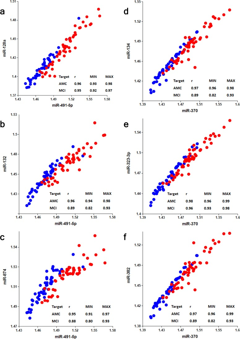Selection of an optimal denominator (normalizer) for each miRNA family was shown to be essential [20]. miR-491-5p and miR-370 were found to be effective when paired with miRNAs of the miR-132 and miR-134 families, respectively. This finding has been further tested in the present study. Figs. S2-S4 and Table 2 show that if normalizers are switched between the two families, pairs miR-128/miR-370, miR-132/miR-370, miR-874/miR-370, miR-134/miR-491-5p, miR-323-3p/miR-491-5p and miR-382/miR-491-5p differentiate MCI from AMC with much lower sensitivity and specificity. Concentrations of miRNAs in plasma depend on numerous factors, including (i) levels of miRNA expression in various organs and tissues; (ii) levels of miRNA secretion from different cell types; (iii) stability of miRNAs in extracellular space and their appearance in plasma in different forms, such as exosomes and other micro-vesicles, complexes with proteins, lipids and, possibly, other molecules; and (iv) blood-brain barrier permeability for brain-enriched miRNAs. A pathological process may affect some or all of these factors. It is, therefore, logical to expect that a numerator and a denominator of an effective biomarker miRNA pair should share some of these basic common factors (e.g. both are brain-enriched and secreted in exosomes) and would change differently in response to a pathology). In such cases, one can expect a high correlation between miRNAs of miR-132 and miR-134 families and their optimal respective normalizers, miR-491-5p and miR-370. Data presented in Fig. 5 demonstrate that in the AMC cohort Spearman test r values for the correlation between miRNAs of the miR-132 family with miR-491-5p are in the 0.95-0.96 range and for the correlation between miRNAs of the miR-134 family with miR-370 are in the 0.97-0.98 range. In the MCI cohort, the correlation between the same miRNAs is slightly lower, indicating that the pathology differently affects plasma levels of miRNAs of the miR-132 family and of miR-491-5p, as well as levels of miRNAs of the miR-134 family and of miR-370. Correlations between neurite/synapse-enriched miRNAs from one family with the optimal normalizer of another family are significantly weaker (Fig. S5).