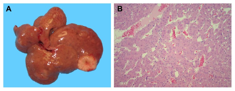 As already mentioned, naturally occurring pyrrolizidine alkaloids, including RS, are known for their ability to promote the growth of early hepatic nodules in initiated rat liver [15]. However, no studies have been reported to date on the long term effects of these agents in animals previously given a carcinogen. In the present experiments, rats were administered DENA and RS (two single injections, 10 days apart), and they were killed 1 year later. As predicted, multiple pre-neoplastic and neoplastic hepatocellular lesions, ranging in size from a few mm to 2.5 cm in diameter, were observed in all animals exposed to this protocol (figure 1, panel A). Furthermore, histological analysis confirmed the pre-sence of large, advanced hepatocyte nodules in all liver samples in this group, while trabecular HCC was diagnosed in 4 out of 8 rats (figure 1, panel B).