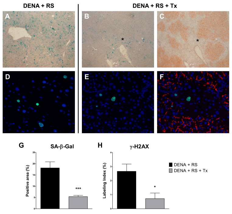 As mentioned in the Introduction, recent findings have indicated that exposure to RS induces extensive hepatocyte senescence in rat liver [10]. Although cell senescence can represent a fail safe mechanism to alt neoplastic progression of altered cells [17], it is now well established that it can also contribute to the emergence of the neoplastic phenotype, possibly through secretion of a host of factors, variably referred to as senescence-associated secretory phenotype (SASP) [18] or senescence-messaging secretome (SMS) [19], and comprising cytokines, growth factors and proteases. Based on this information, it became important to determine the presence of hepatocyte senescence in animals treated with DENA+RS or DENA+RS+Tx. As reported in figure 3, markers related to cell senescence were highly expressed in animals treated with DENA+RS and killed 4 months later; these included the senescence-associated β-galactosidase (SA-β-gal), (panel A); and the phosphorylated form of H2A histone family, member X (γ-H2AX), which is considered as a marker of persistent activation of a DNA damage response and a trigger of cell senescence (panel D). However, both changes were almost completely reversed in animals given DENA+RS followed by hepatocyte transplantation. Transplanted hepatocytes were able to extensively repopulate the host liver; this effect was already prominent at 4 months post-injection (Figure 3, panel C), and persisted after 1 year (data not shown); it was associated with decreased expression of both SA-β-gal and γ-H2AX, which were virtually absent in repopulated areas of the liver and were only detected in residual portions of endogenous parenchyma (figure 3, panels B, C, E, F, G and H).