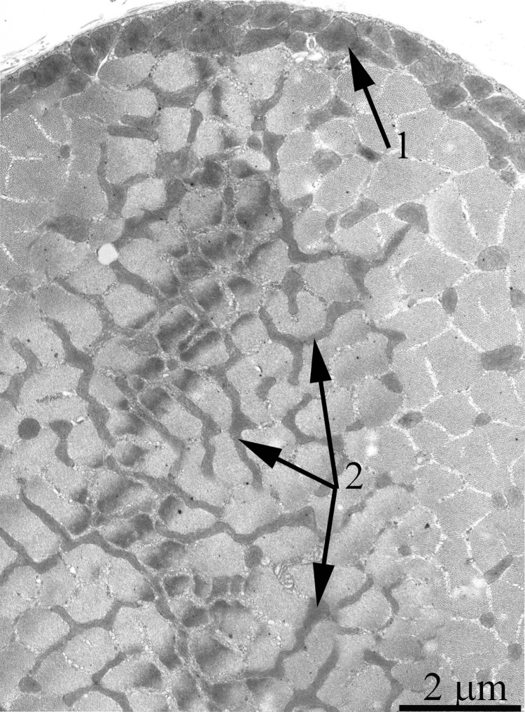 As was previously shown using three-dimensional reconstitution of ultrathin serial sections [26-29], the mitochondrial profiles in skeletal muscles are united to the mitochondrial reticulum stretching along the muscle fiber. Fig. 1 presents a cross-section of a skeletal muscle fiber of the young Wistar rat. One can see a well-developed network of the mitochondrial reticulum consisting of a subsarcolemmal population of mitochondria (the arrow 1) and an interfibrillar system of stretched mitochondria (the arrows 2). The inner ultrastructure of mitochondria (Fig. 2A) revealed the cristae arranged in mutually parallel manner.